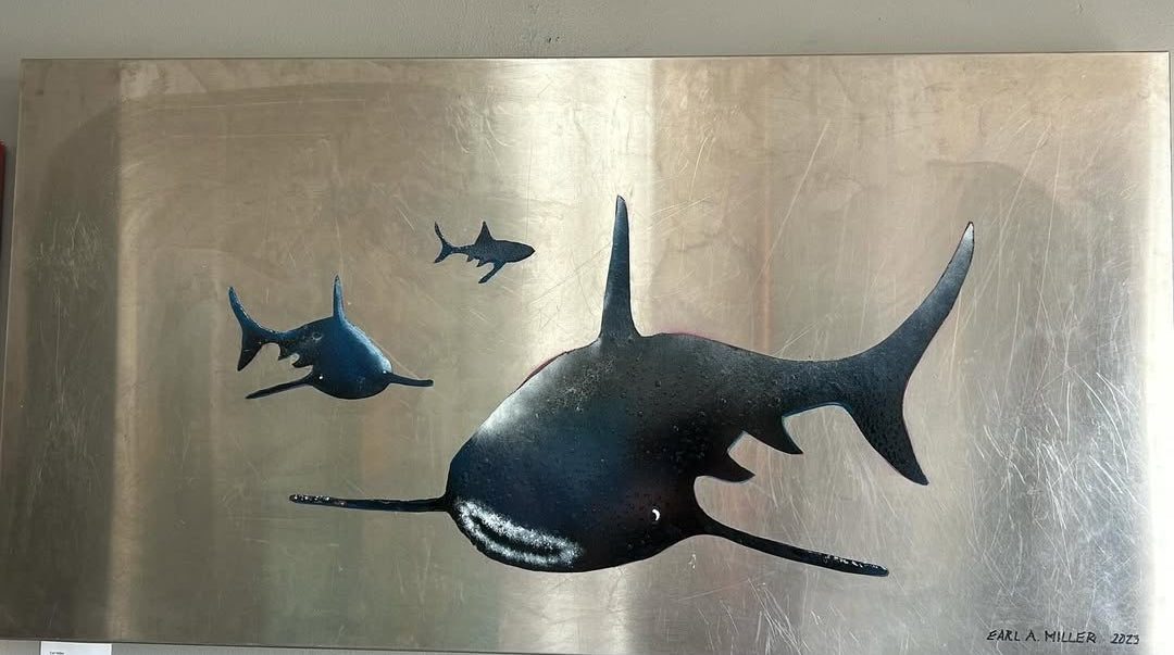 I found this junked stainless steel work table and removed the legs, thinking it would be a great surface to paint on. The inspiration for the painting came from my encounter with three sharks while swimming off the west coast of Florida. My background includes teaching high school art, practicing architecture and interior design, designing state sets, and about everything “artsy”. After retirement, I found my way to Soulard Art Gallery and have been a resident artist there for seven years.